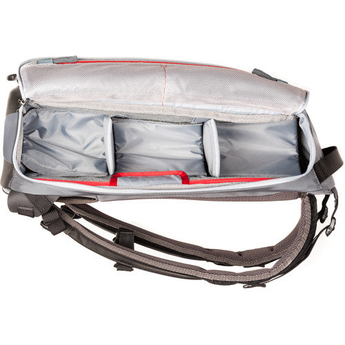 Built to fit snugly against the body, the PhotoCross 13 is designed to be rotated from one's back to front for easy reach into its camera compartment. Access to the camera compartment is then provided by a top-facing zippered panel with a 180° upward opening. Along the inside of that zippered panel are two zippered, mesh organizational pockets which can be used to store and organize camera batteries, memory cards, or small electronics. Within the camera compartment and towards the side of the backpack that rests against the wearer is a slip pocket with room for a 13" laptop computer, while six adjustable and removable dividers allow that compartment's space to be configured according to the specific camera equipment placed inside.