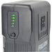 The Fxlion Cool Black Series 14.8V Lithium-Ion Battery (130Wh, Gold Mount) outputs 14.8V, has a 130Wh, 9.0Ah capacity, and supports up to an 8A draw. It features both D-Tap and DC outputs that can be used for charging as well as discharging. It also sports a 5V, 2A USB Type-A output for charging smartphones or other mobile devices.