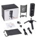 Included with the mic are a pop shield, a tripod desk stand, a ring mount, a 48-inch long USB cable and USB-C cable, and a storage pouch.
