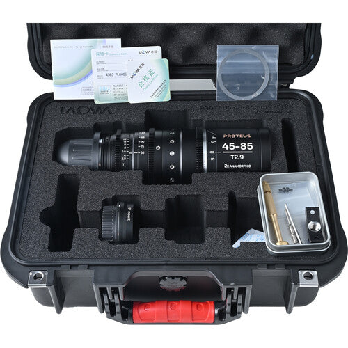 The Venus Optics Laowa Proteus 2X 45-85mm T2.9 Anamorphic Cine Lens (Blue, PL Mount with Interchangeable EF Bayonet) covers Super 35 sensors and is ideal for handheld, stabilizer use, and fast setups. Combined with the separately available Proteus 26-45mm zoom, the two lenses provide a wide, versatile 26-85mm range and a 3.27x zoom ratio.